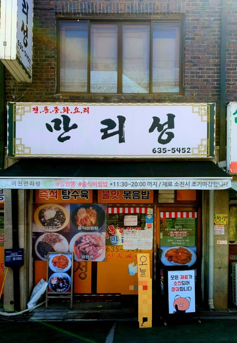 1. **만리성**: 이천 부발읍에 위치한 현지인 맛집으로 웨이팅이 있을 정도로 인기가 많습니다. 알짬뽕, 간짜장, 찹쌀 탕수육이 대표 메뉴입니다[8][16]. 노키즈존(8세 이하)으로 운영되며, 브레이크 타임(14:00-17:00)이 있습니다.