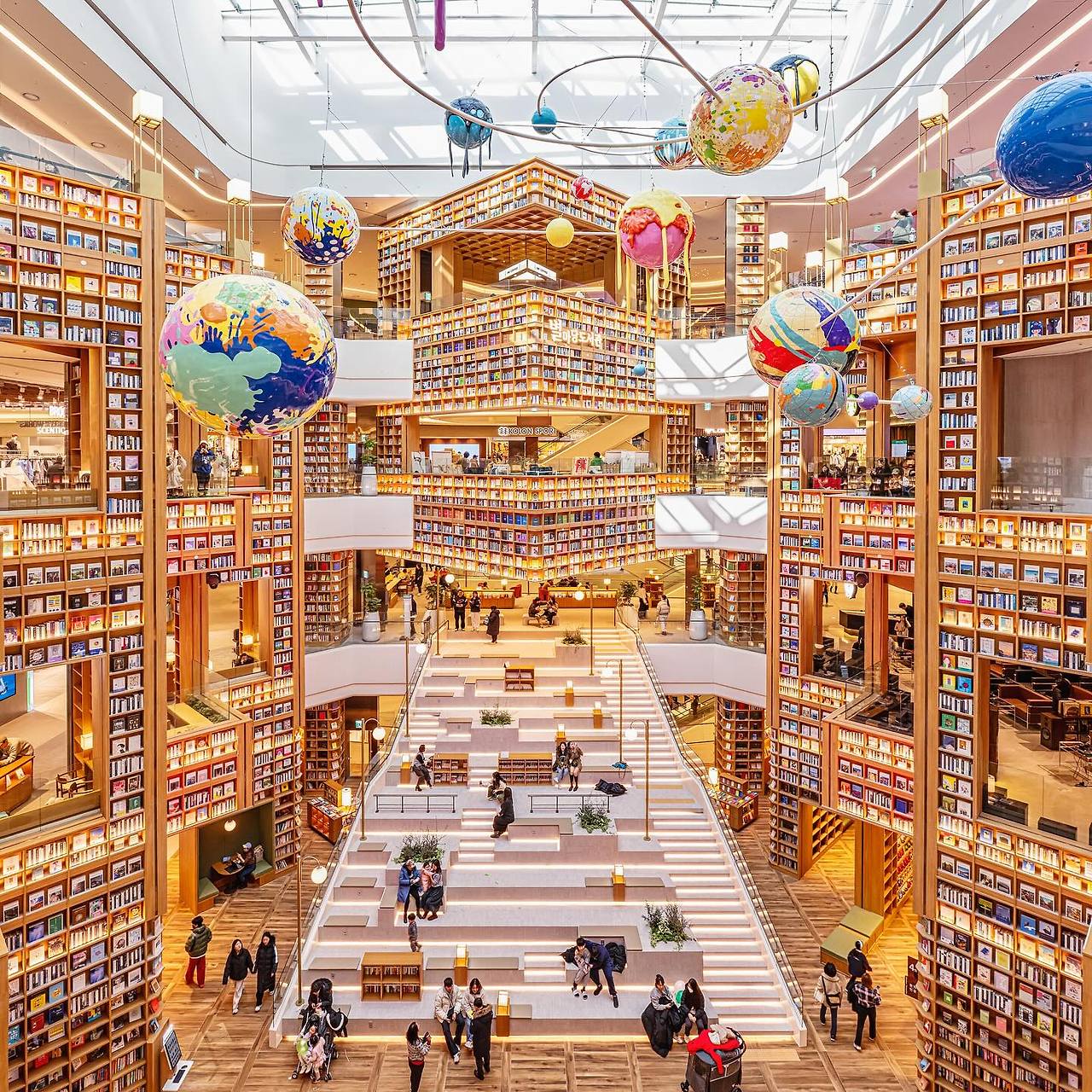 - 인생샷 명당: 4층 메인 광장은 사람이 너무 많아요. 에스컬레이터를 타고 6층이나 7층 사이드 난간으로 가세요. 반대편 서가와 트리를 배경으로 찍으면 웅장함이 배가 됩니다.