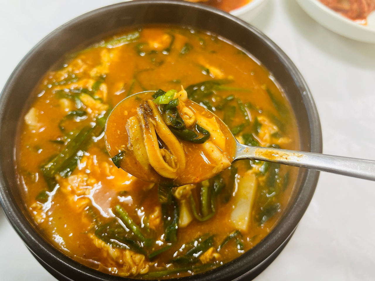 속초 정원식당의 섭국은 고추장을 베이스로 한 얼큰하고 칼칼하면서도 걸쭉한 국물이 특징입니다 . 일부 방문객은 신라면보다 매운맛이라고 표현하기도 했습니다 . 국물 안에는 큼직하게 썰어 넣은 자연산 섭과 함께 부추, 팽이버섯, 감자, 수제비, 새우, 풀어진 계란 등 푸짐한 건더기가 들어있어 든든한 한 끼 식사로 손색이 없습니다 . 특히 전날 과음 후 해장 음식으로 매우 좋다는 평가가 많습니다 . 맵기 조절을 위해 다진 청양고추를 요청하면 제공해줍니다 .