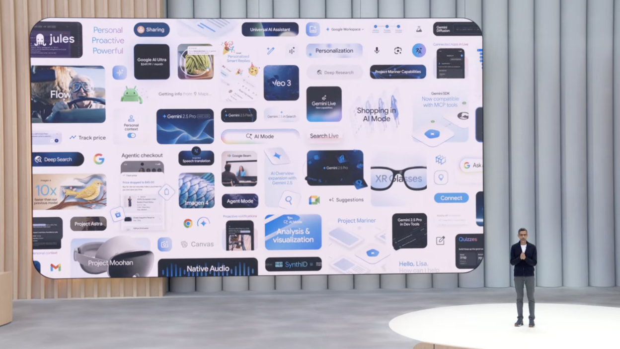 - 제미나이 앱: 월간 활성 사용자(MAU) 수가 4억 명을 돌파했으며, 제미나이 2.5 프로 사용량이 45% 증가하는 등 높은 성장세를 보였다. 모든 안드로이드 및 iOS 기기에서 스크린샷 및 실시간 카메라 화면에 대해 질문할 수 있는 제미나이 라이브(Gemini Live) 기능이 출시된다. 사용자의 프롬프트에 따라 연구 및 작업 완료가 가능한 AI 에이전트 모드도 곧 추가될 예정이다.